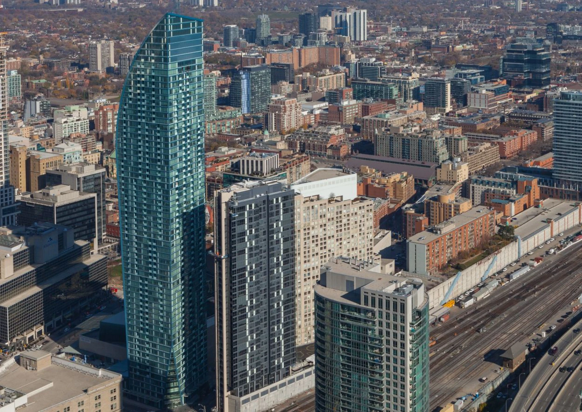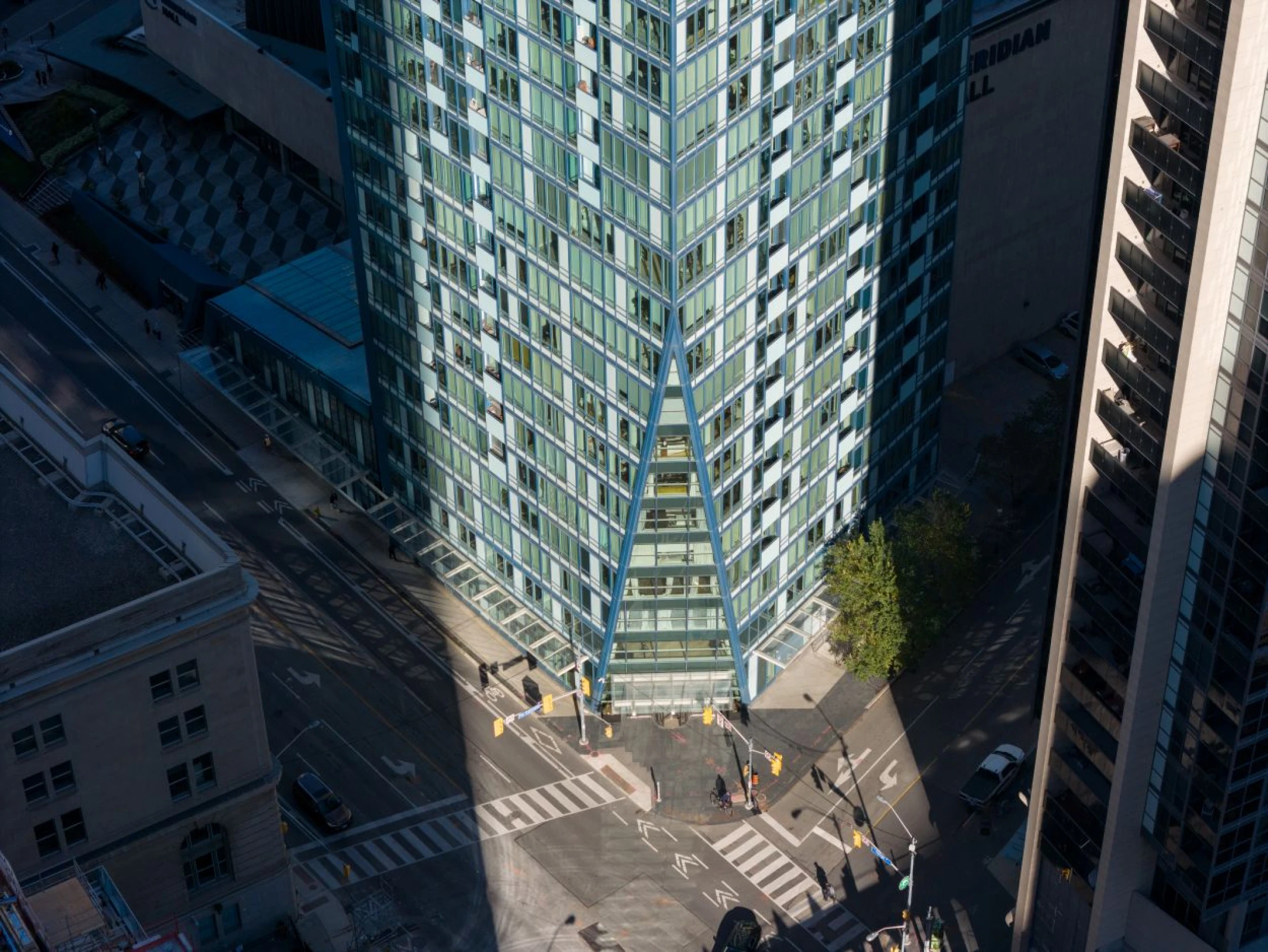 L Tower's curved north wall gives it a unique appearance from every angle, and prevents the tower from casting a shadow on adjacent Berczy Park. The tower's location, on top of a 50-year old performing arts centre, also presented a special challenge in tying the buildings together.