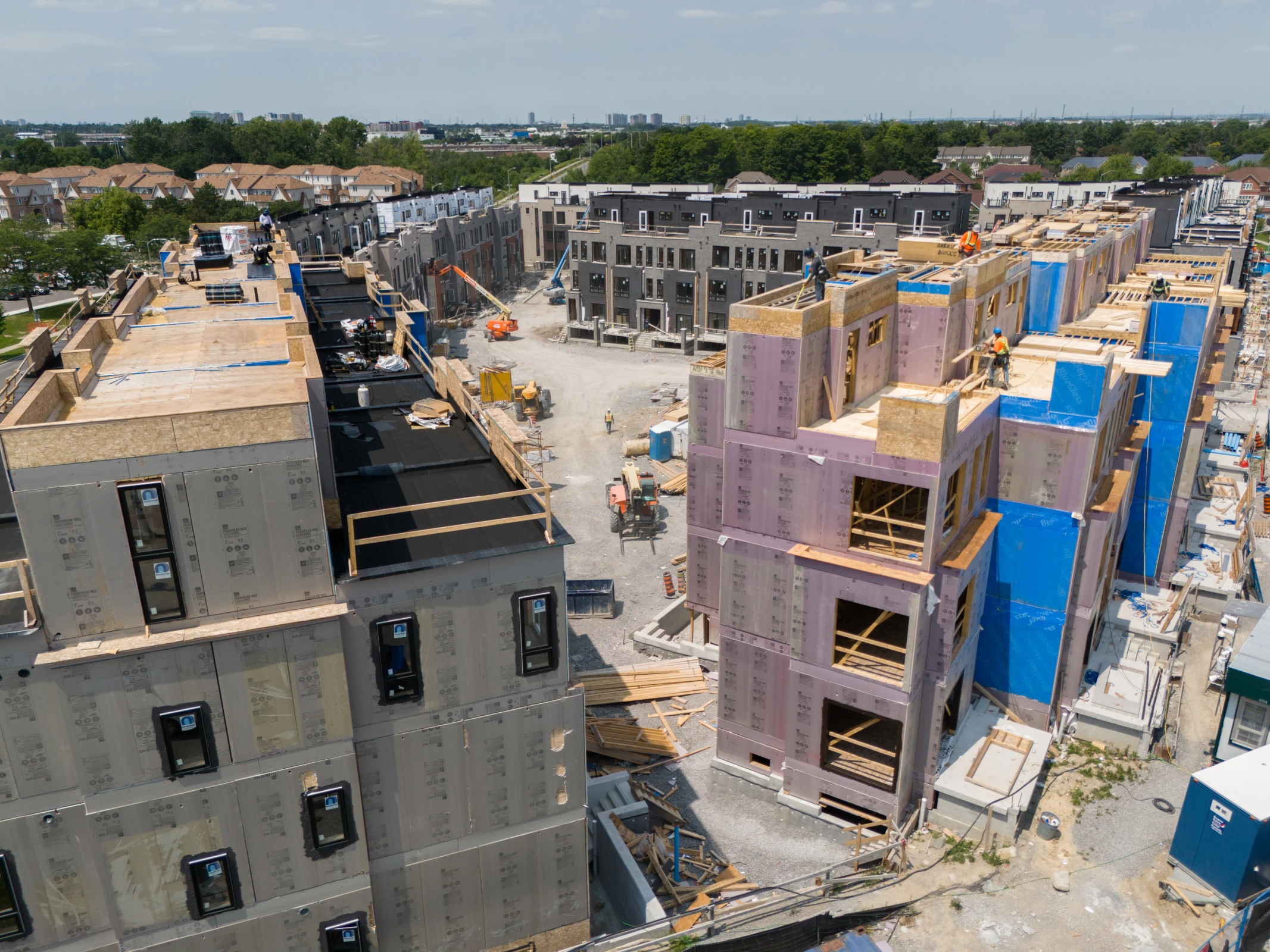 The townhouses were constructed with wood framing using prefabricated modular panels. Floors and walls were constructed offsite and assembled onsite for an expedited schedule. The wood framing was carefully detailed to provide fire separation between each residential unit including concrete masonry unit (CMU) firewalls.