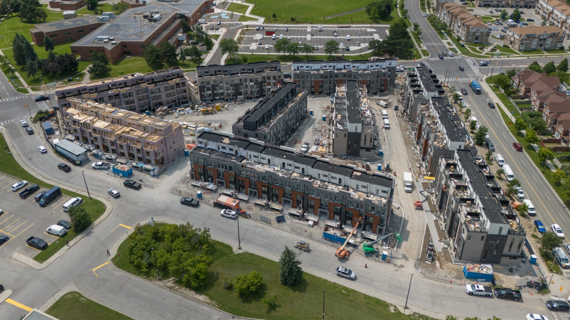 The parking garage covers most of the site’s footprint and provides a foundation for 8 of the 10 townhouse blocks as well as laneways, planters, and a small park area. Built with cast-in-place concrete, this substructure includes a perimeter wall to resist the lateral loads imposed by the 2 townhouse blocks that do not rest on top of the parking garage.