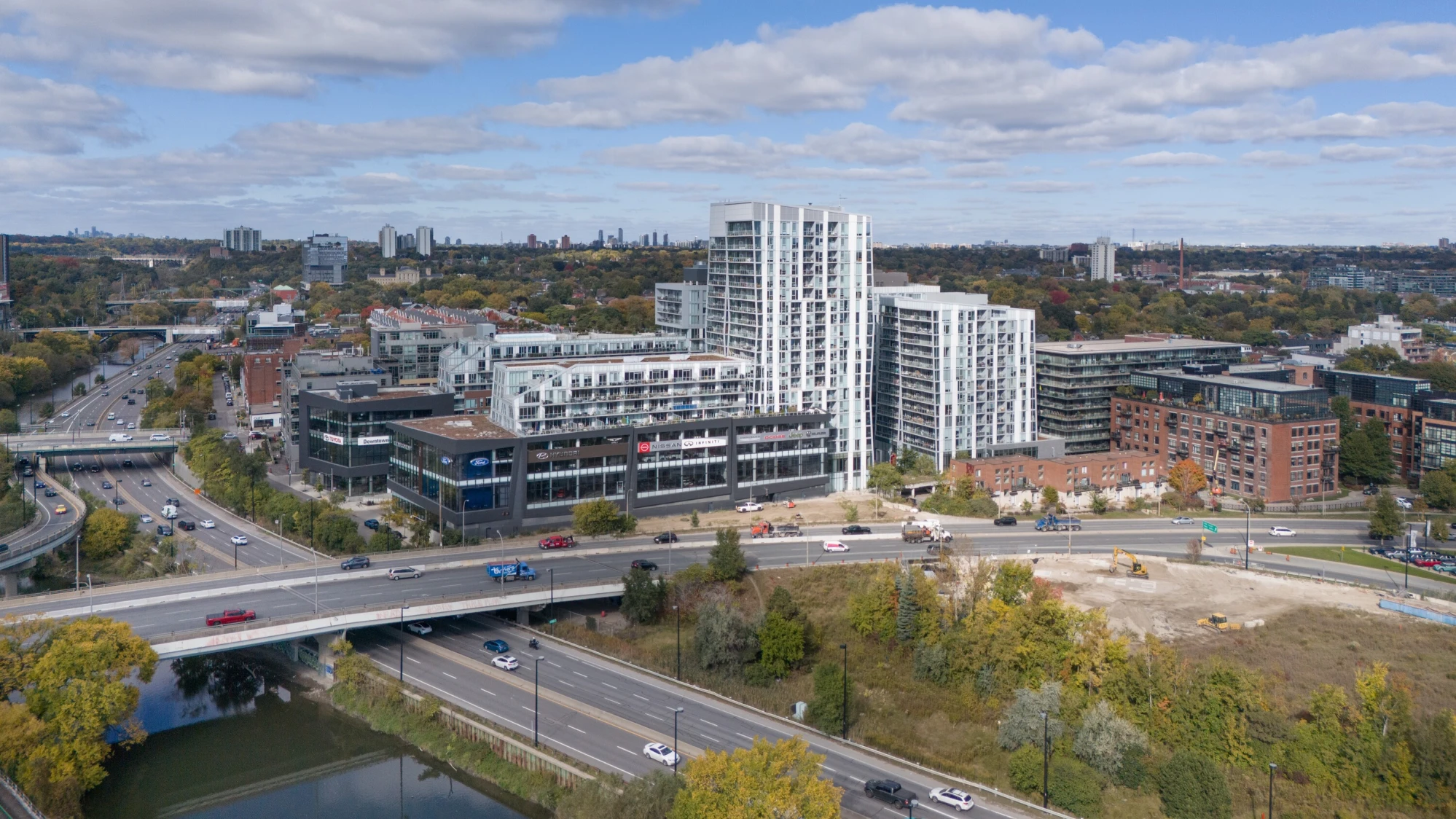 Mid-rise towers along Baseball Place and Queen Street East supply nearly a thousand condo units and bring much-needed density to the area.
